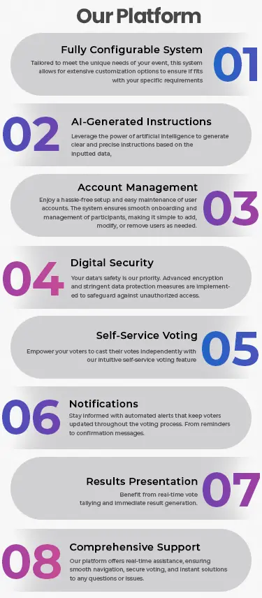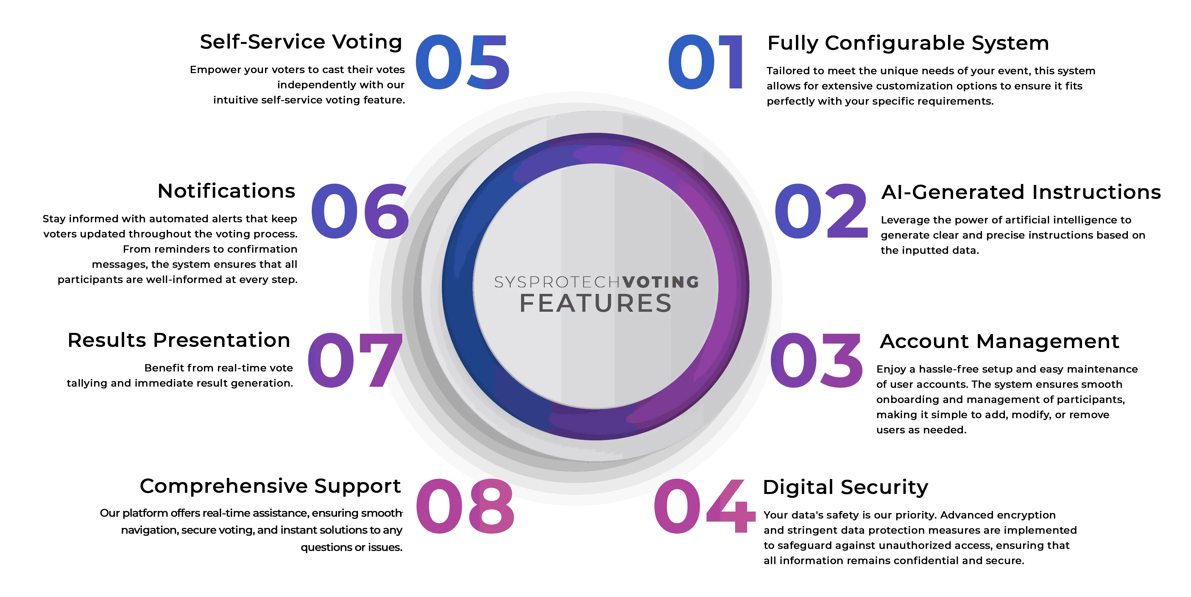 The Sysprotech Online Voting System offers a cutting-edge solution for pageants and competitions. Our platform is designed to be user-friendly, secure, and efficient, ensuring a seamless voting experience. With features like account setup, data protection, real-time results, and comprehensive support, Sysprotech Voting guarantees accurate and instant vote tabulation. Perfect for any event requiring reliable and transparent voting, Sysprotech stands out as the premier choice for digital voting solutions.